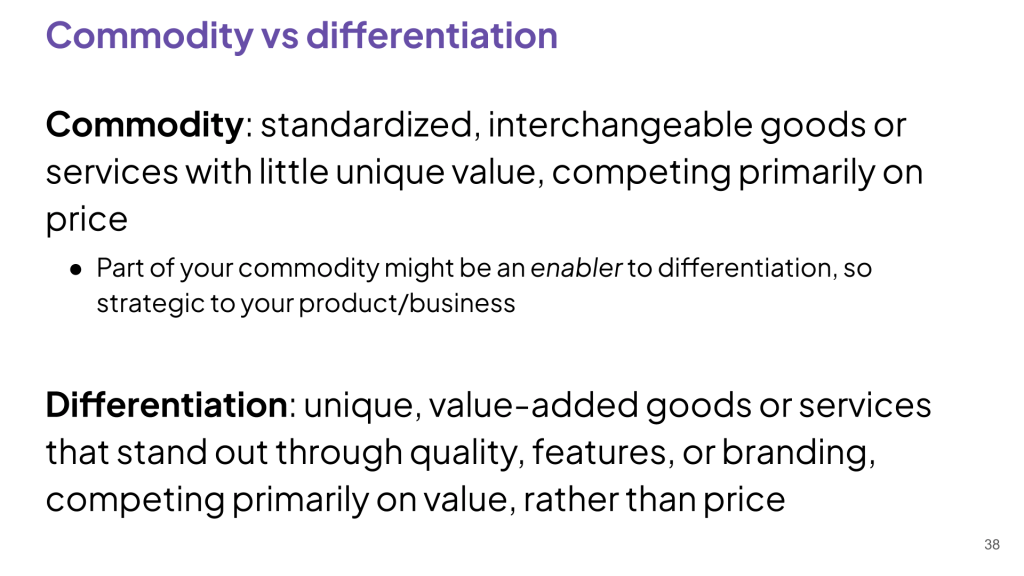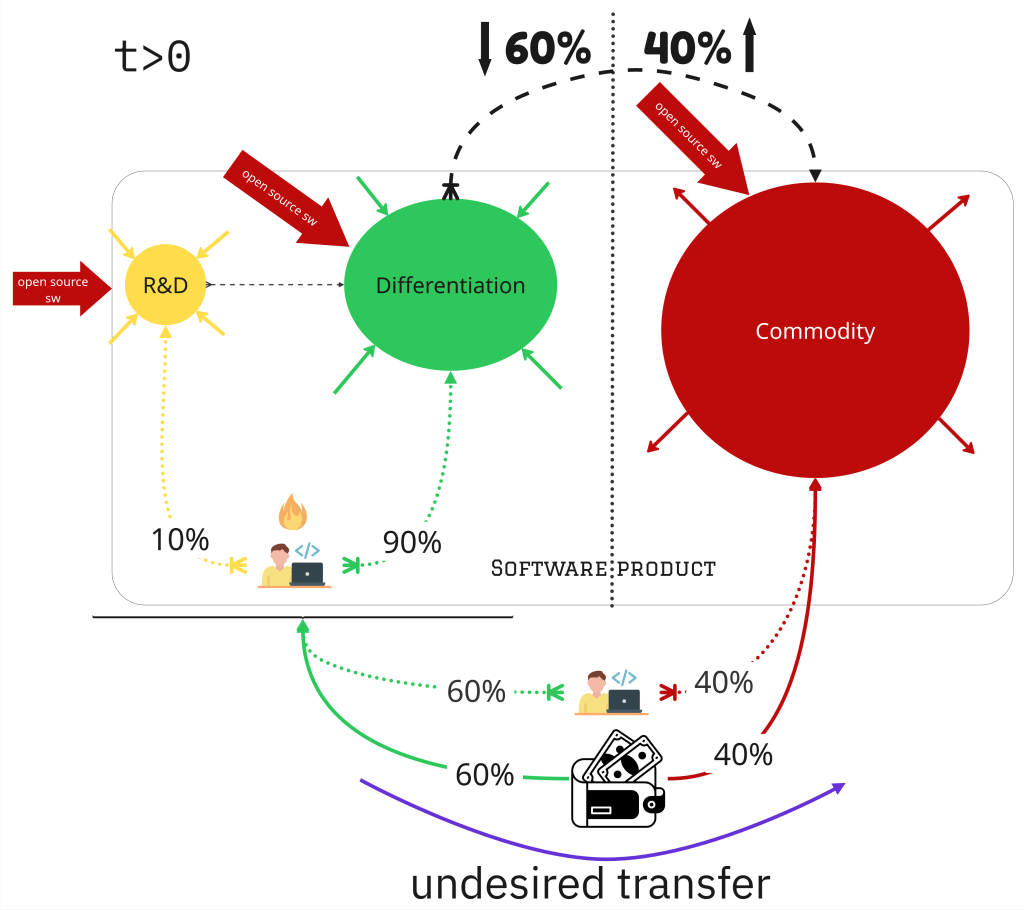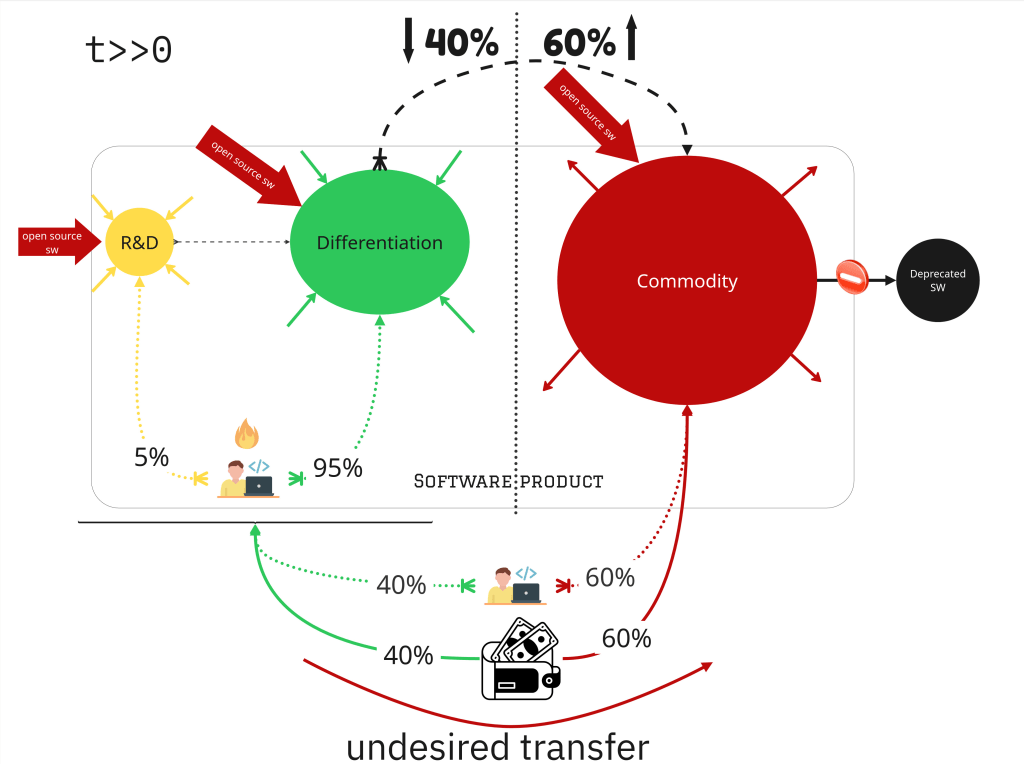 - Over time, differentiation turns into commodity. The amount and complexity of commodity software grow, and maintaining it consumes more resources and capital. This reduces the capacity to focus on new differentiation. The problem is amplified by the heavy use of open source and purchased proprietary software — often without enough internal knowledge about them.