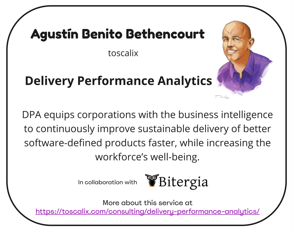 Delivery Performance Analytics has been designed based on each other’s strengths. Agustín is the service architect and lead consultant, complementing a team of outstanding consultants, software and data engineers as well as data analysts from Bitergia.
